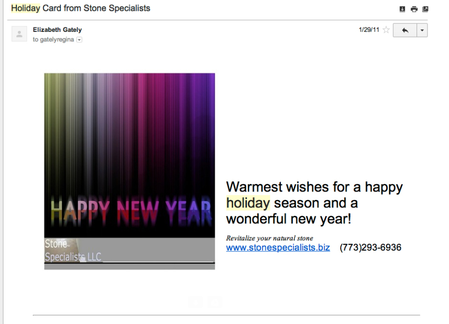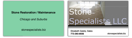 Logotype, website, mobile website, uniform designs, and shown, business cards, proposal/contract form, brochures. Writing and editing. Collaborating with client. stonespecialists.biz. We work with them to create holiday cards showcasing artwork by the client and get them new business each year.