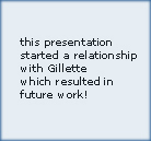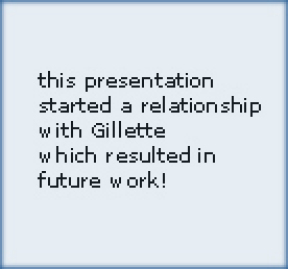 Also worked with this client on full color, slides for laptop presentation, illustrations of concepts, which the client pitched to Gillette, and resulted in future work.