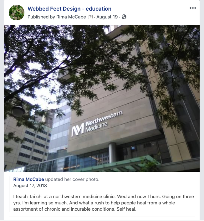 We led biweekly Tai Chi classes at Northwestern Memorial Hospital Stone Institute Clinic (3 yrs.) and Amita Health (1 year). We
