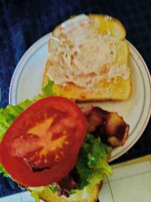My life sure got better when I learned how to make a few things that I really like to eat! pictured here: Mom's Chicken Catchetori with Angel Hair Pasta, classic BLT with a summer tomato, a glass of ice water, and blueberry french toast which I have often.