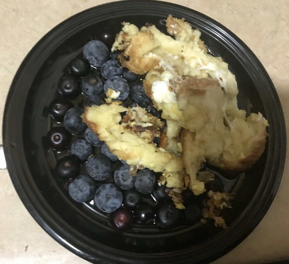 Yum! delicious French Toast with blueberries and maple syrup. 1 egg, splash milk, 2 slices bread.